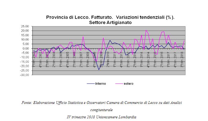 In decisa frenata, e con un andamento peggiore rispetto alla media regionale, l’andamento dell’artigianato: nel quarto trimestre 2018 solo la produzione evidenzia una modesta variazione tendenziale positiva: +0,5% (tra i territori lombardi, solo Milano evidenzia un valore peggiore, +0,4%); negativo, invece, il trend di ordini e fatturato (entrambi -0,5%). In Lombardia la produzione è cresciuta dell’1,4%, gli ordini dello 0,5%, il fatturato dell’1%. L’indice medio della produzione artigiana lecchese 2018 si è attestato a 107,2 (media 2010=100), con un aumento del 2,1% rispetto al 2017; quello degli ordini a 104,5 (+0,7%) e quello del fatturato a 109,4 (+1,6%). La media lombarda è molto più bassa: si è attestata, rispettivamente, a 98,2, 95,2 e 99,8. Peraltro, anche a Lecco siamo ancora molto distanti dai valori pre-crisi: nel 2007 (sempre con base 2010=100) il valore medio dell’indice della produzione era ben 129,2; per gli ordini 128,4; per il fatturato 123,8. Rispetto al 4° trimestre 2017, “minerali non metalliferi”, “pelli-calzature” e “meccanica” sono i settori che registrano l’aumento più elevato della produzione artigianale (rispettivamente +5,4%, +4,3% e +2,4%), mentre i settori con le peggiori performance sono “abbigliamento” (-8,9%) “siderurgia” (-5,9%) e “legno-mobilio” (-4,9%). Negli ultimi tre mesi dello scorso anno si evidenzia un calo dell’occupazione artigiana lecchese: -0,7% (contro il -0,4% regionale); l’indice medio dello scorso anno si è attestato a 103,7 (media 2010=100), +0,1% rispetto al 2017. In Lombardia l’indice medio 2018 è pari a 98,6 (+0,8% rispetto al 2017). Tuttavia i dati rimangono molto distanti da quelli pre-crisi: a fine 2007 (sempre con base 2010=100) il valore lecchese era 107,6 e quello lombardo 107,7.
