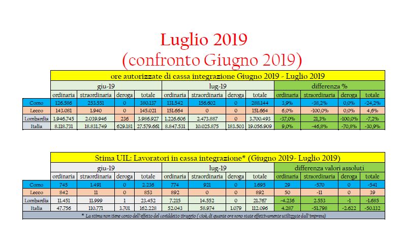 Il 7° rapporto UIL del Lario anno 2019 sulla cassa integrazione nelle Province di Como e Lecco, relativo al periodo gennaio-luglio 2019, manifesta una situazione difficile e preoccupante dell’economia e del mercato del lavoro nei nostri territori.