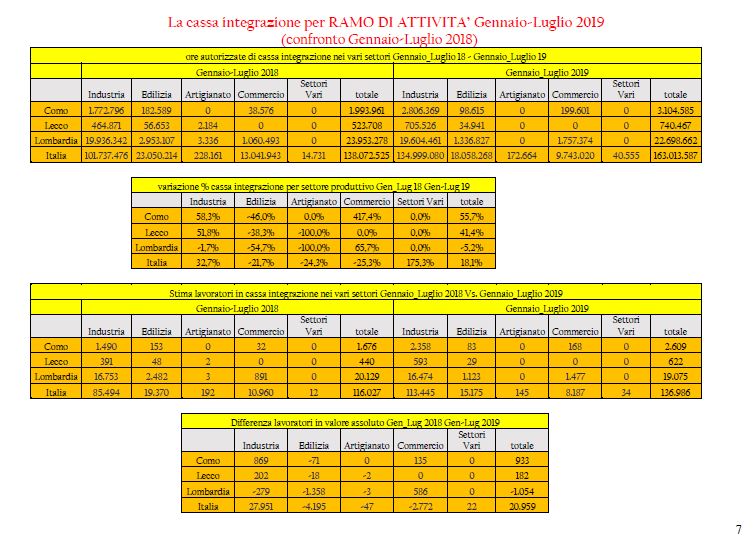 Il 7° rapporto UIL del Lario, conferma la situazione di incertezza e di difficoltà che vivono le imprese dei nostri territori. A soffriremaggiormente sono le aziende dei due distretti più rilevanti del tessuto economico produttivo delle due Province: Tessile per Como e Metalmeccanico per Lecco, in questi due settori sono in aumento i lavoratori in cassa integrazione nei primi 7 mesi del 2019 rispetto allo stesso periodo del 2018: