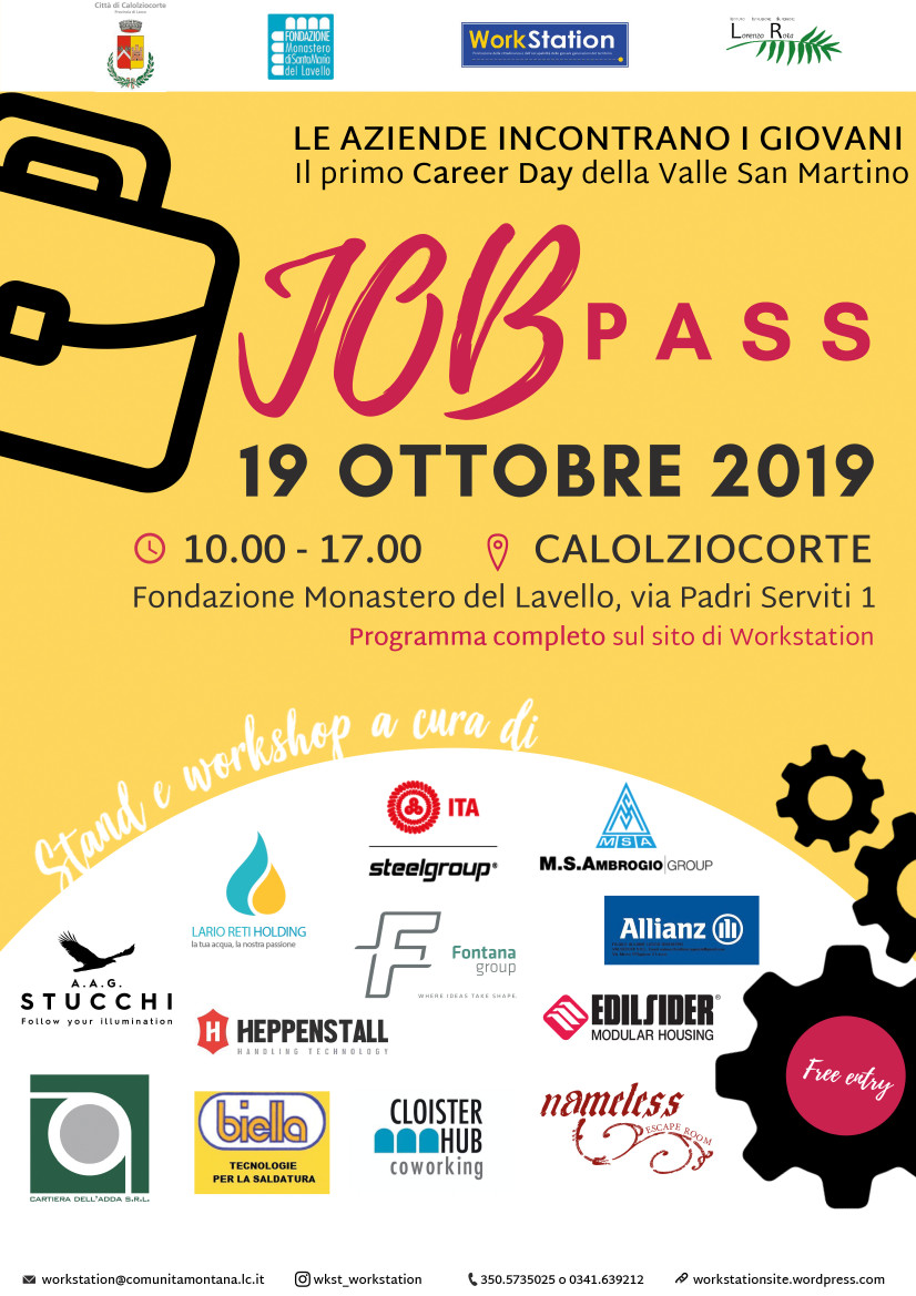 Sabato 19 ottobre 2019 per la prima volta a Calolziocorte il JOB PASS, una giornata d’incontro tra giovani e aziende del territorio per promuovere il matching tra domanda di lavoro giovanile e offerta.