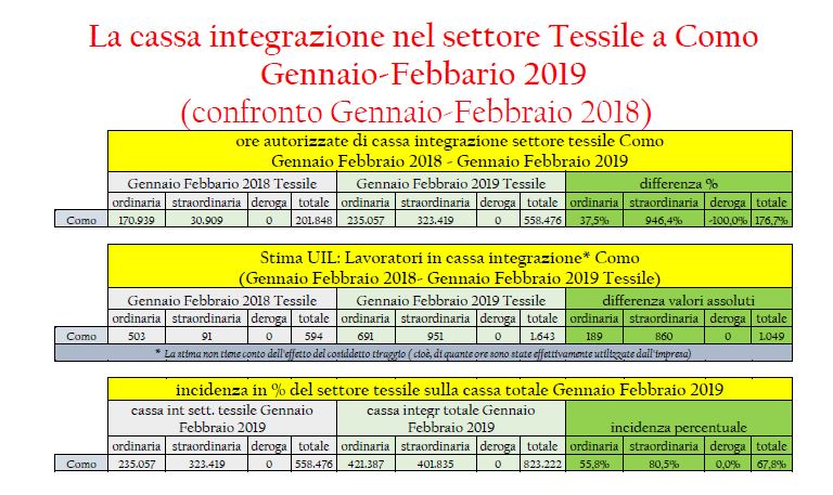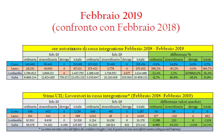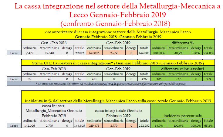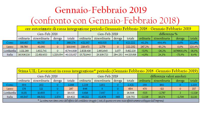 Il 2° rapporto UIL del Lario, anno 2019, sulla cassa integrazione nelle Province di Como e Lecco, relativo al primo bimestre 2019, conferma le preoccupazioni di una situazione economica difficile: aumenta la richiesta di ore di cassa integrazione totale da parte delle imprese dei due territori nel primo bimestre rispetto allo stesso periodo 2018: