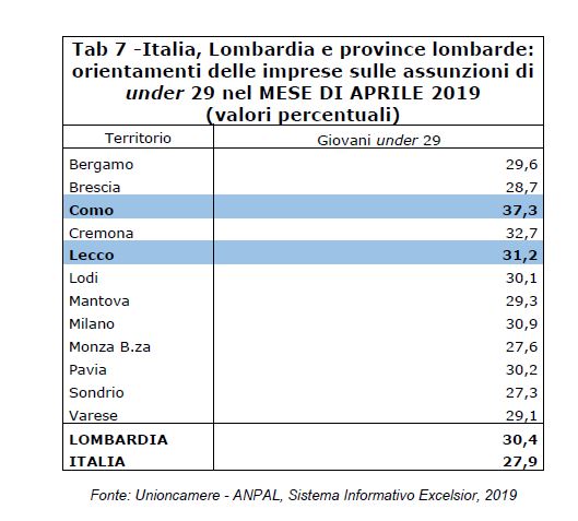 Nel mese di aprile 2019, sulle 6.460 assunzioni programmate dalle imprese lariane la quota con contratto a tempo indeterminato scende al 27,9% (a marzo era del 29,4%). Lecco, con il 28,9%, mantiene il quinto posto tra i territori lombardi (dietro a Mantova, Milano, Varese e Monza Brianza, rispettivamente con il 43,4%, 35,1%, 32,9% e 31,8%). Como, con il 27,3%, occupa il 6° posto, recuperando 5 posizioni. La quota delle nuove assunzioni a tempo indeterminato previste ad aprile dalle imprese lariane resta inferiore alla media lombarda (che scende dal 33% al 30%), ma torna più alta di quella nazionale (che diminuisce dal 30,6% al 26,9%).