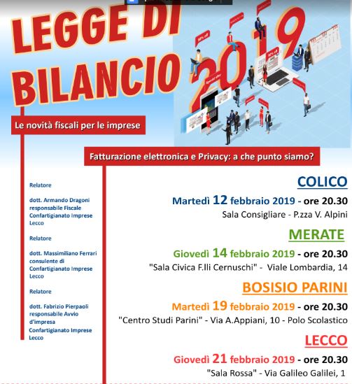 Quali sono le novità contenute nella Finanziaria 2019 con ricadute dirette sulle imprese? Estensione del regime forfetario, raddoppio delle deducibilità IMU su capannoni, recupero per le imprese in contabilità semplificata delle perdite fiscali 2017, proroga e rimodulazione degli iperammortamenti, la rivalutazione dei beni d’impresa, la revisione delle tariffe INAIL e la conferma del credito d’imposta e formazione 4.0 e altro ancora. Sono queste le principali misure adottate dal Governo nella Legge di Bilancio 2019 e che saranno al centro di quattro serate organizzate da Confartigianato Imprese Lecco sul territorio nel mese di febbraio.