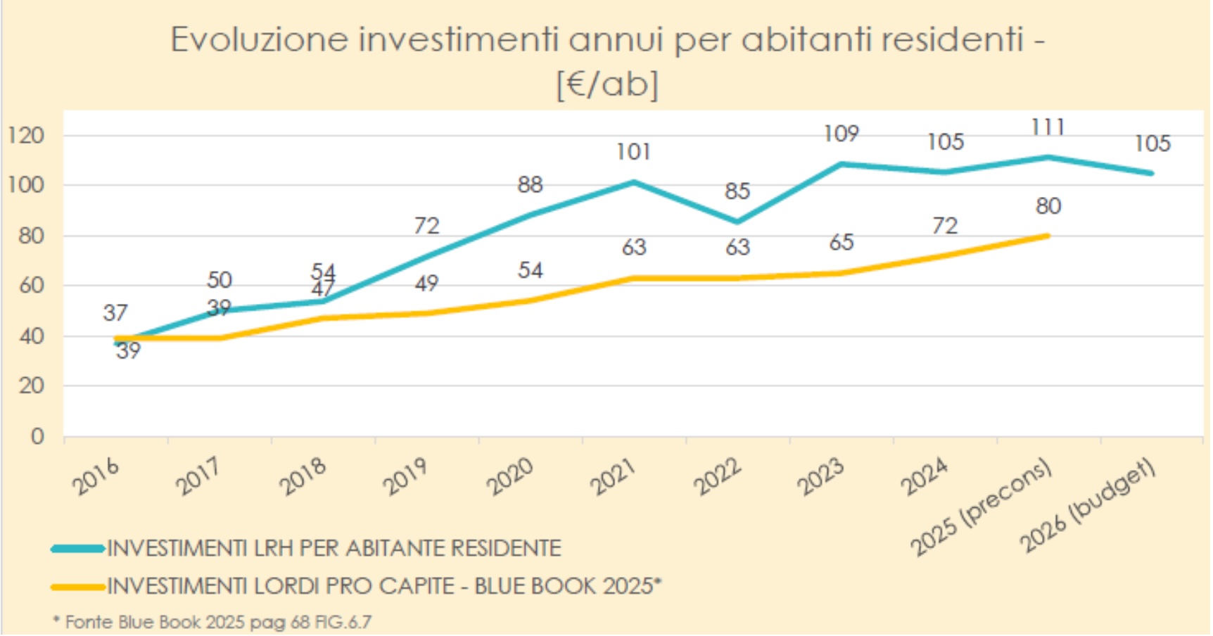 Sul 2026 permane l’alto volume di investimenti – previsti 35 milioni, pari a circa 105 euro/abitante, valore sensibilmente superiore alla media nazionale (fonte Blue Book 2025) – a conferma della tendenza rilevata nel periodo 2016-2025, durante il quale gli investimenti realizzati complessivamente sono stati pari a circa 272 milioni di euro (comprensivi del preconsuntivo 2025) e destinati principalmente alla protezione dell’ambiente, tramite il rinnovo e l’ammodernamento delle infrastrutture di acquedotto, fognatura e depurazione, e alla digitalizzazione e all’innovazione dei servizi.