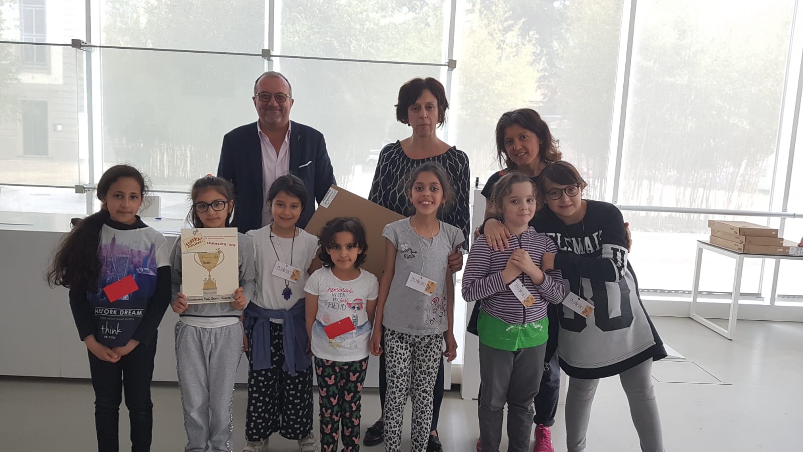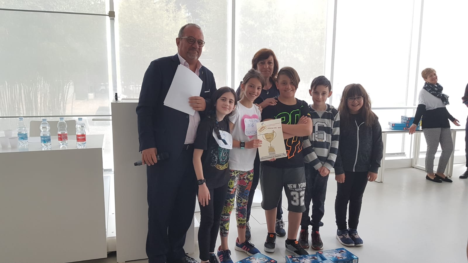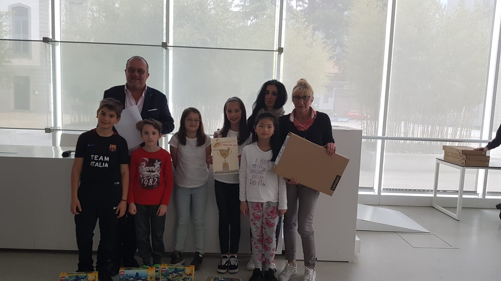A tutti i componenti dei gruppi finalisti è stato attribuito un riconoscimento di partecipazione individuale. Ogni bimbo del gruppo vincitore si è invece aggiudicato un gioco. Alla scuola di appartenenza di ognuna delle squadre sul podio è invece stato consegnato un pc portatile. Le squadre della Scuola Primaria Montello – Istituto Comprensivo Merate e dell’Istituto Comprensivo G. Gavazzeni di Talamona parteciperanno il 24 maggio all’evento finale – in programma a Treviso – con tutti i gruppi delle classi quinte che hanno primeggiato nelle rispettive province sull’intero territorio nazionale.