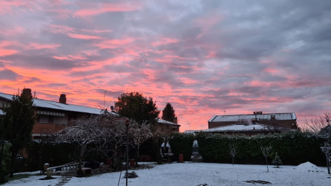 In questo freddo venerdì 10 dicembre 2021 tanti, tantissimi sono rimasti affascinati e  hanno immortalato il cielo che si è trasformato in una tavolozza di colori con sfumature che dal rosa arrivavano fino al rosso fuoco.  Un vento meteo davvero suggestivo. E  proprio sul fronte meteo cosa dobbiamo aspettarci da questo fine settimana? Per la giornata di oggi, secondo il bollettino di Arpa Lombardia,   è atteso l’arrivo di una nuova perturbazione con precipitazioni deboli e locali, ancora una volta nevose fino a quote molto basse. Nel weekend prevalenza di sole ma con temperature che si manterranno invernali. Venti forti sulle Alpi.