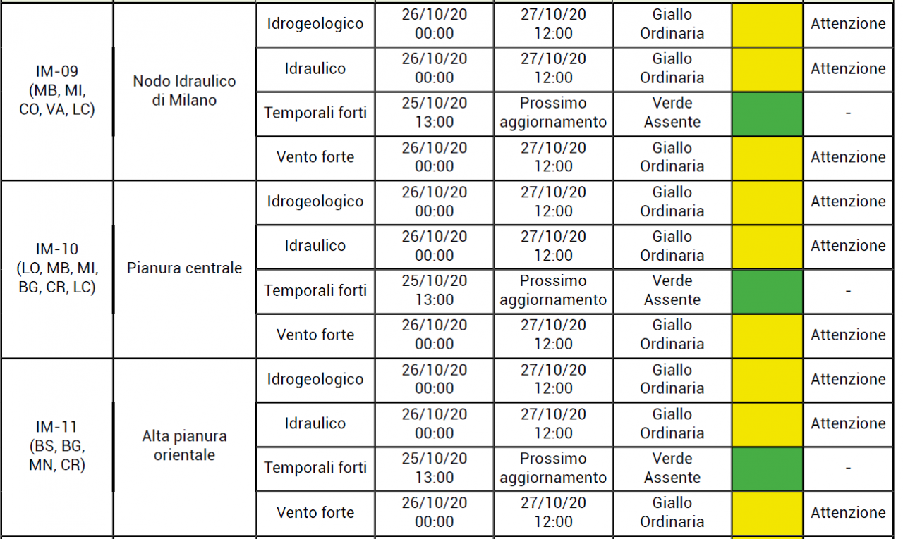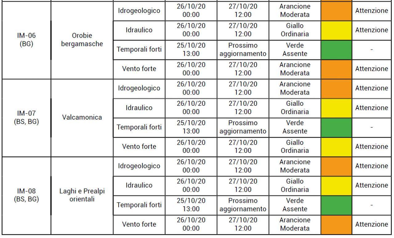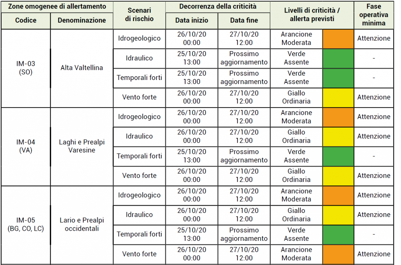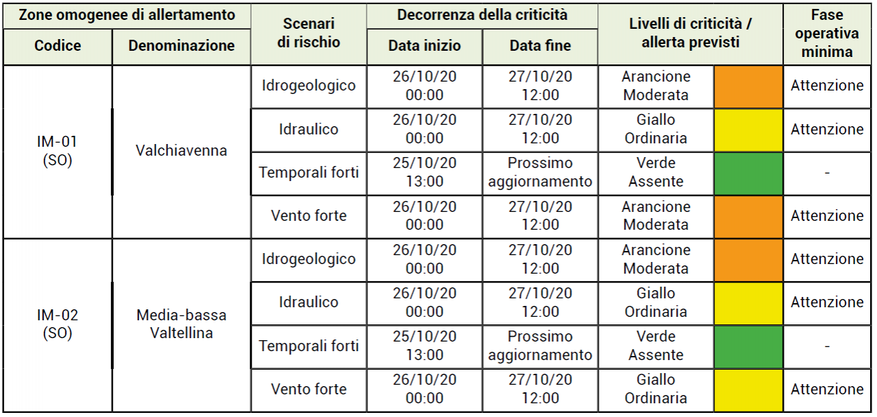 Dal pomeriggio di domenica progressiva intensificazione in alta quota dei venti dai quadranti meridionali. Dalle prime ore di domani e sino a fine giornata venti forti anche a quote comprese tra 700-1500 m, con raffiche fino a 90 km/h e velocità medie orarie tra 20-40 km/h. Sulla pianura venti in rinforzo su valori moderati o localmente forti (con fase acuta tra le ore 06 e le ore 18 di domani 26/10), con raffiche fino a 55 km/h.