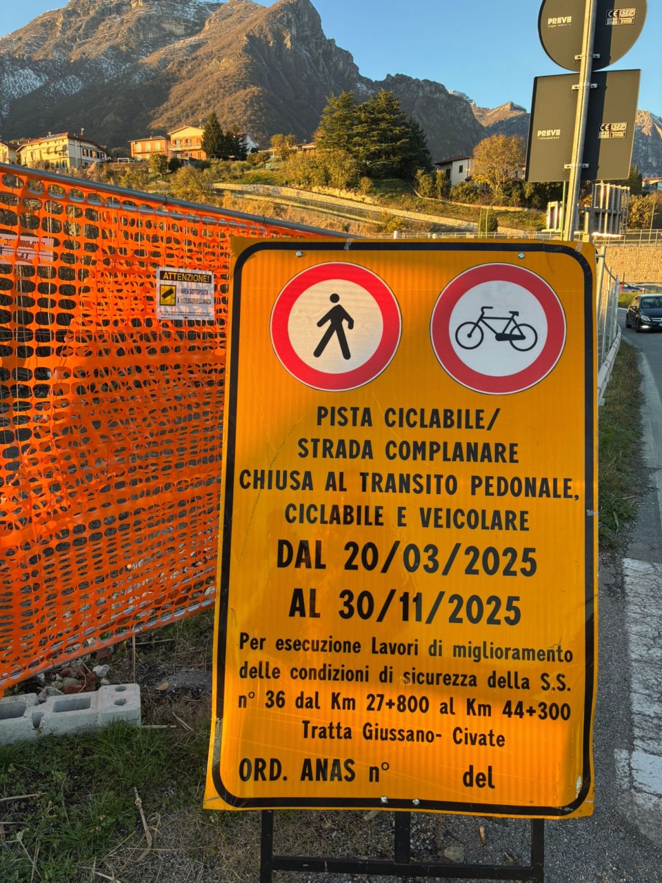 Nello specifico, rileviamo che il cartello di cantiere indica al 30 novembre 2025 la data di fine dei lavori della “pista ciclabile/ strada complanare”, opera finanziato da Anas tra le opere per le Olimpiadi Milano-Cortina 2026. Eppure, nella conferenza di questa mattina è stato riferito che i lavori in questione verranno conclusi a gennaio 2026. E, se fosse così, ci chiediamo: 1) quali sono le ragioni del ritardo? 2) come mai non è stato rettificato il cartello di cantiere? 3) sono stati eventualmente prorogati i termini dei titoli abilitativi edilizi? In merito alla SS36, teniamo a ricordare che alcuni tratti della Statale sono stati oggetto di adeguamento negli anni (in particolare il tratto da Cinisello Balsamo a Giussano), altri sono interessati da lavori in corso (si veda il tratto da Lecco fino a Colico, con diverse gallerie da rifare e/o consolidare), senza dimenticare i lavori di ampliamento o creazione di tangenziali sulla complementare S.S. 38 che permettono di superare l’attraversamento dei centri abitati della Valtellina.