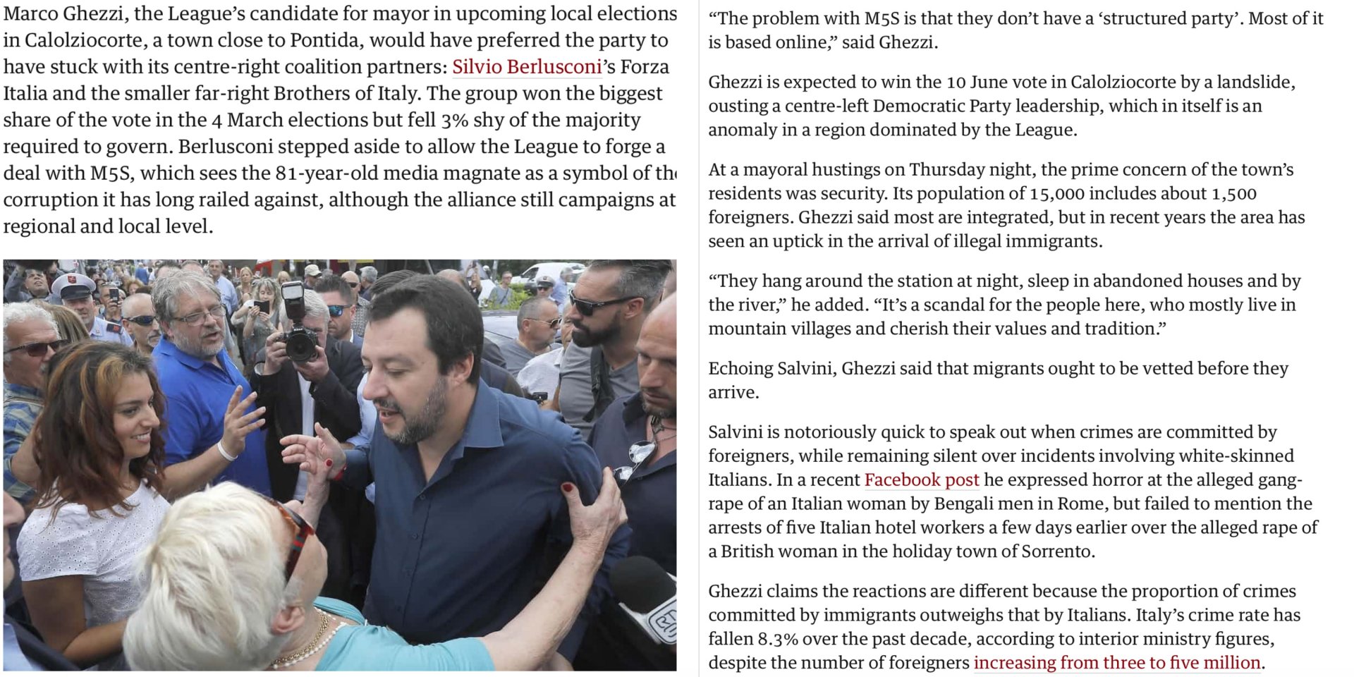 Notoriamente, Salvini è pronto a parlare apertamente quando i crimini vengono commessi da stranieri, mentre rimane in silenzio riguardo ad incidenti che coinvolgono italiani dalla pelle bianca. In un recente post su Facebook ha espresso orrore per il presunto stupro di una donna italiana da uomini bengalesi a Roma, ma ha omesso di menzionare gli arresti di cinque lavoratori alberghieri italiani pochi giorni prima sul presunto stupro di una donna britannica in vacanza città di Sorrento.