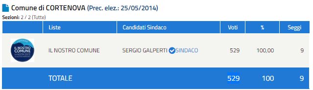 Conquisto il quorum e raggiunta la maggioranza dei voti validi a Cortenova dove il nuovo primo cittadino è Sergio Gaplerti. La sua lista, il nostro Comune, ha ottenuto 529 preferenze pari a l 100%