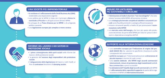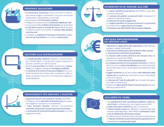 Tra i punti in evidenza spiccano il Codice Appalti, i tempi di pagamento, fondamentale per stabilire un rapporto sano tra le MPMIe le grandi imprese, e la grande battaglia legata al “Made In” e quindi alla tutela e alla tracciabilità dei prodotti italiani di qualità. Ma per rilanciare occupazione e fatturato delle piccole imprese non vanno poi dimenticate le riforme del lavoro e dei sistemi di protezione sociale, gli incentivi su competenze e formazione professionale, il sostegno alla digitalizzazione, agli investimenti e all’internazionalizzazione, norme che puntino alla sostenibilità e all’economia circolare e, infine, una reale implementazione del mercato unico europeo. C’è poi un’ultima proposta, che Confartigianato porta avanti da anni nel confronto con l’Europa: la revisione e il rafforzamento dello Small Business Act.