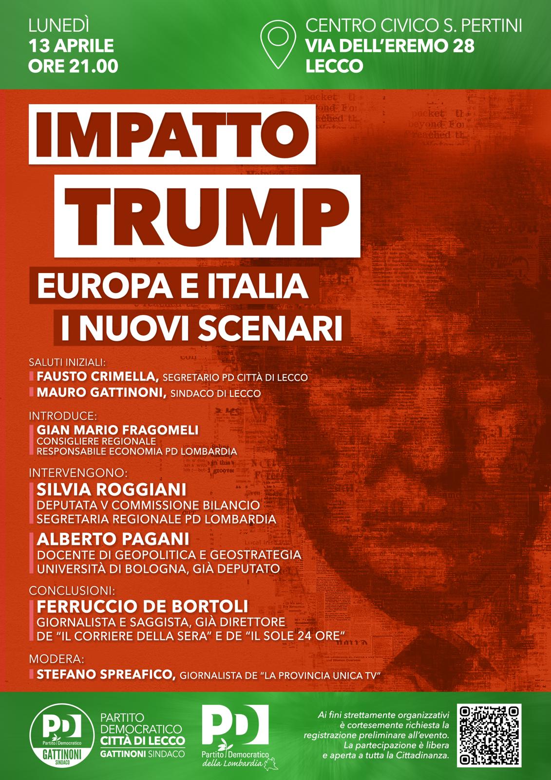 Il Partito Democratico della Città di Lecco e il Partito Democratico della Lombardia promuovono per lunedì 13 aprile alle ore 21, presso il Centro civico Sandro Pertini (via dell’Eremo 28), l’incontro pubblico dal titolo “Impatto Trump: Europa e Italia, i nuovi scenari”.