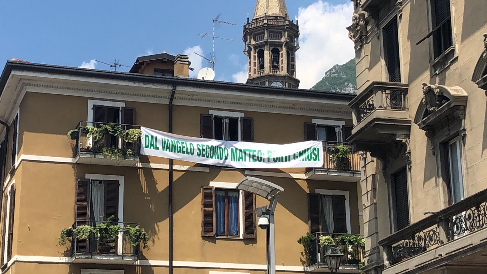 Infuria a Lecco la polemica intorno allo striscione “Dal vangelo secondo Matteo: porti chiusi”