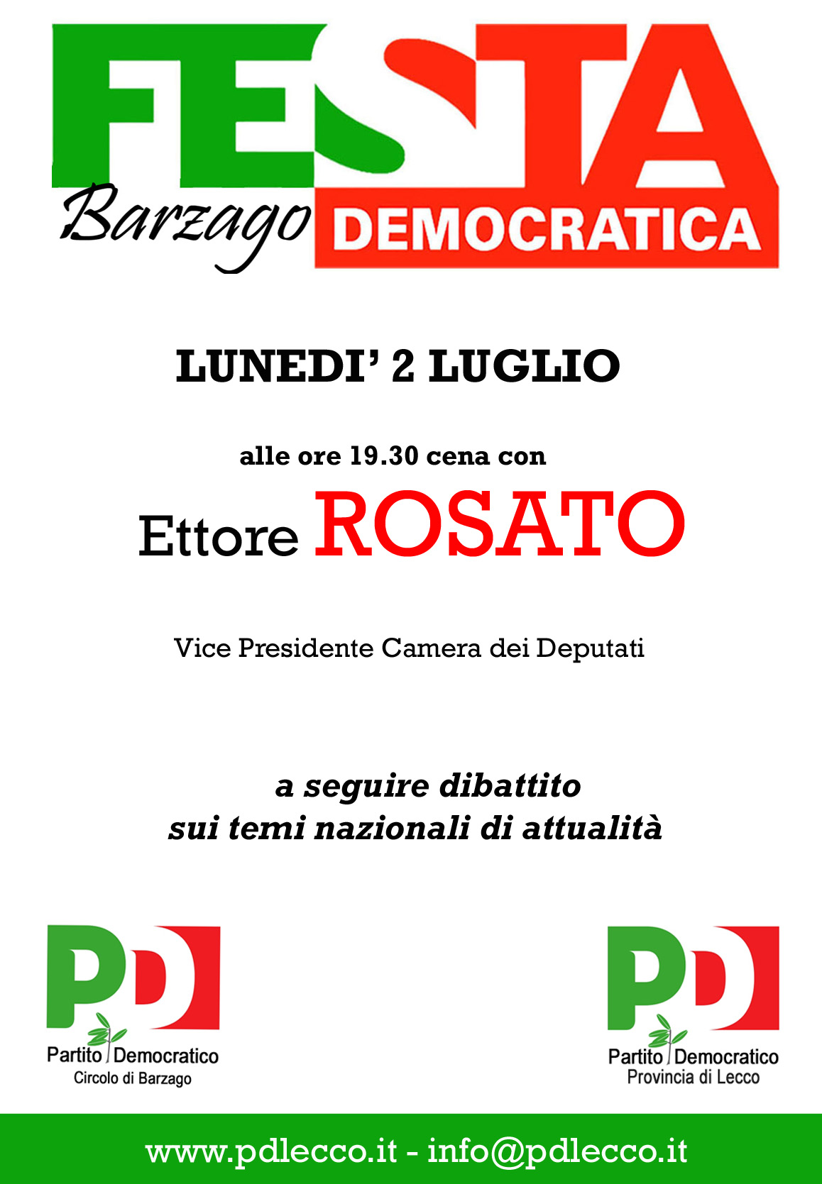 Particolarmente interessante è l’incontro organizzato per lunedì 2 luglio con il Vice Presidente della Camera dei Deputati Ettore Rosato che visiterà la nostra Provincia nel pomeriggio e interverrà alla Festa di Barzago a partire dalla 19.30 per una cena con gli iscritti seguita dal dibattito alle 21.
