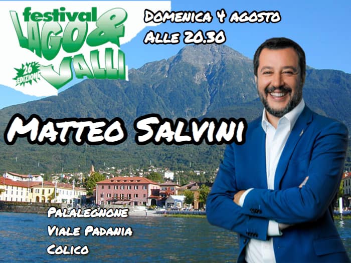 Il numero uno della Lega Matteo Salvini infatti, domenica 4 agosto 2019, sarà a Colico per prendere parte al Festival Lago e Valli, in programma dall’1 al 5 agosto. La kermesse. giunta quest’anno alla 26esima edizione, è organizzata dalla Sezione Lega Nord Colico “G. Canclini ” e la Lega Giovani di Lecco.