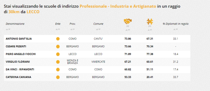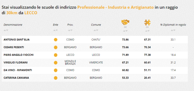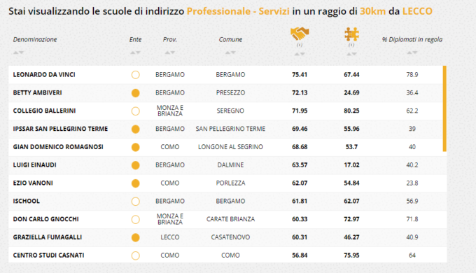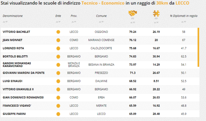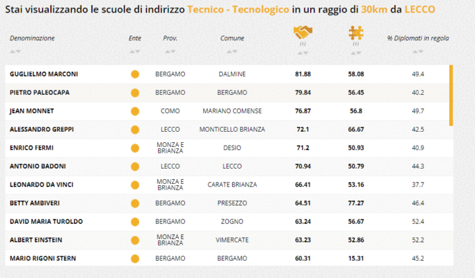 Due i parametri analizzati Eduscopio: da una parte la capacità di licei e istituti tecnici di preparare e orientare gli studenti agli studi universitari. Dall’altra l’attitudine di istituti tecnici e professionali a formare gli studenti per l’ingresso nel mondo del lavoro subito dopo il diploma. Per quanto riguarda i passaggio dalla scuola superiore l’analisi si suddivide in base all’area di studi (liceo scientifico, classico, istituto tecnico economico, ecc.,). Poi per scoprire i migliori istituti è necessario circoscrivere la ricerca all’area di residenza nel raggio di 10, 20 o 30 chilometri. Noi, come ogni anno per analizzare i risultati delle scuole lecchesi abbiamo scelto il raggio più ampio, partendo la Lecco, “sforando” quindi anche nel Monzese, nella Bergamasca e anche nel Comasco.