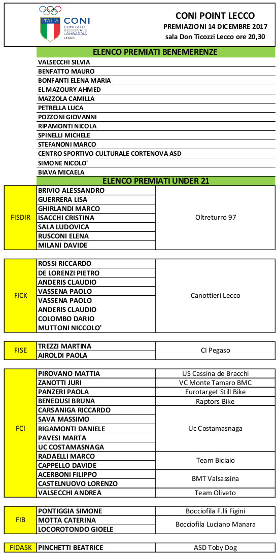 Consegna Benemerenze Coni”. L’ iniziativa, organizzata con il contributo dalla Provincia di Lecco, rende omaggio agli atleti del nostro territorio – categoria Under 21 – che si sono distinti nell’anno 2017, segnalati dalle rispettive Federazioni Sportive Provinciali.