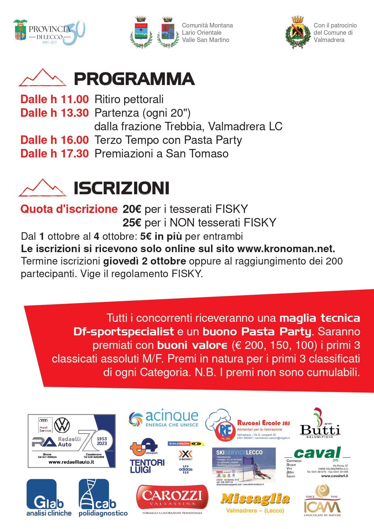 Di seguito il programma: dalle 11 alle 13 è previsto il ritrovo alla partenza e la consegna dei pettorali gara; alle 13.30 partirà il primo concorrente (a seguire tutti gli altri ogni 20 secondi). Terminata la gara, un “Pasta party” al ristoro Osa di San Tomaso, dove alle 17.30 si terranno le premiazioni.
