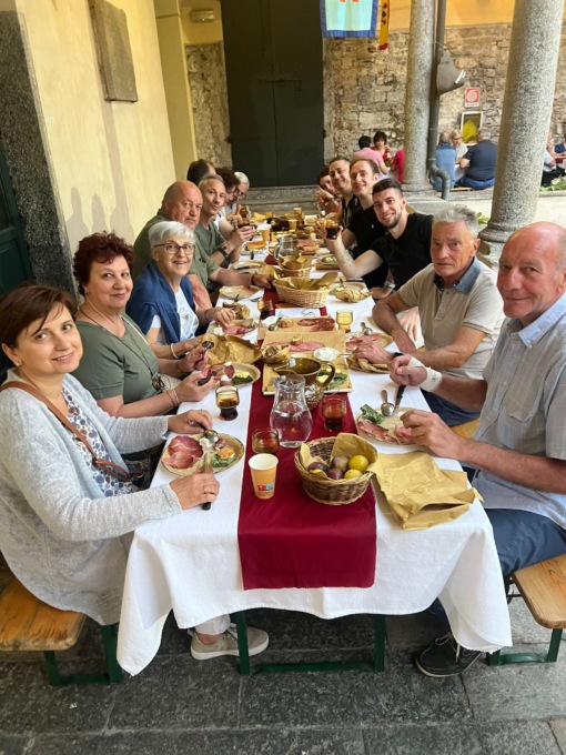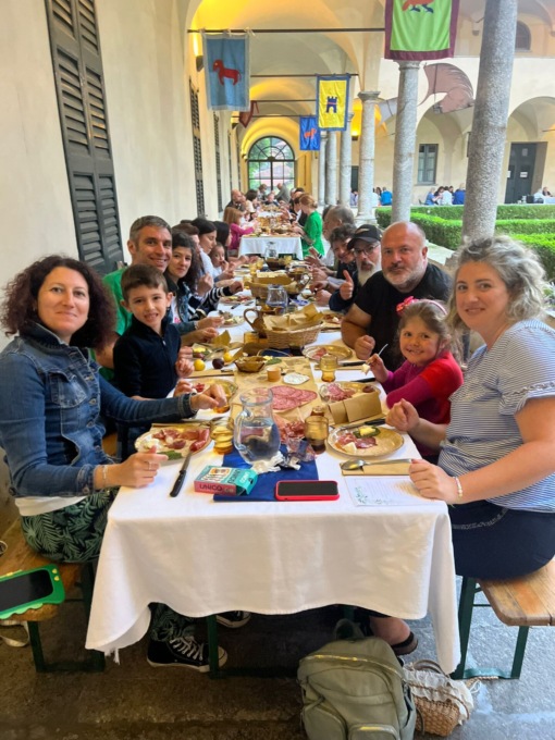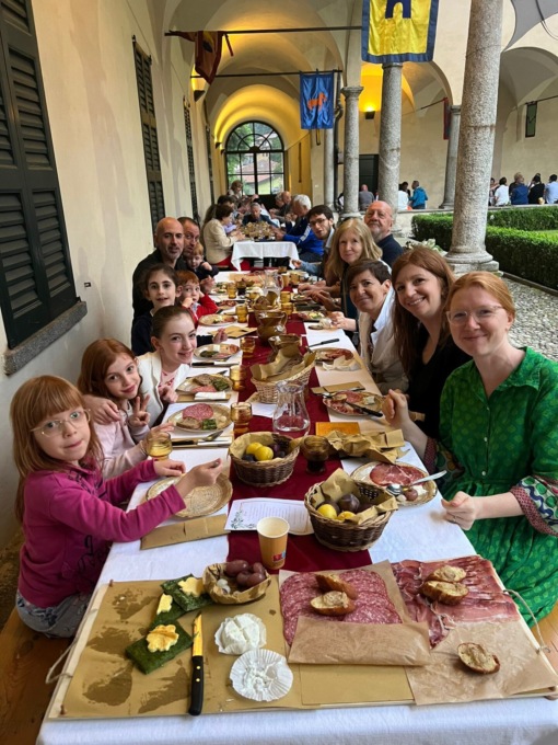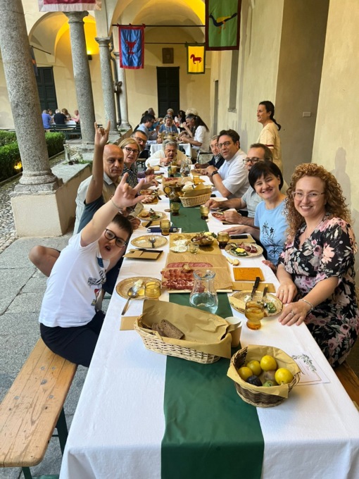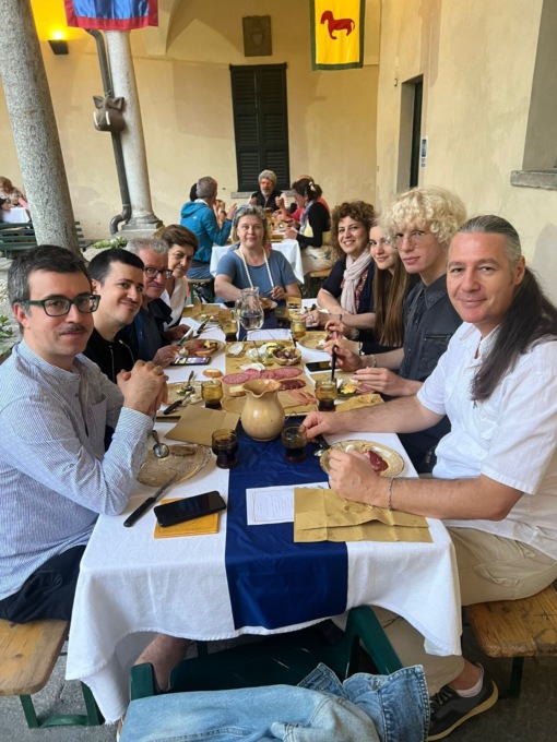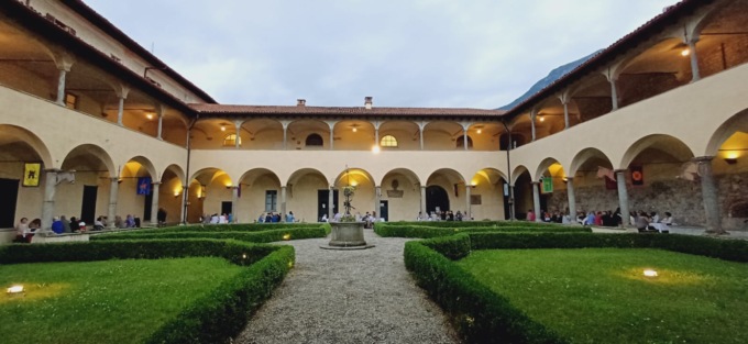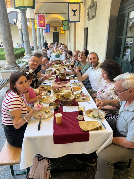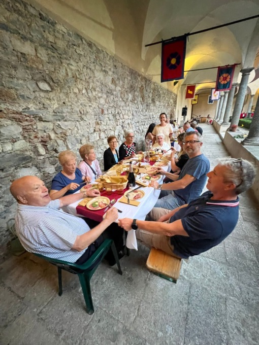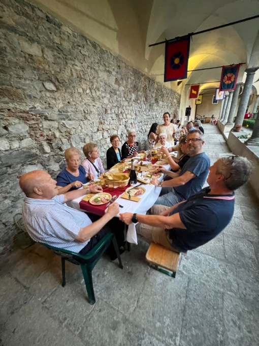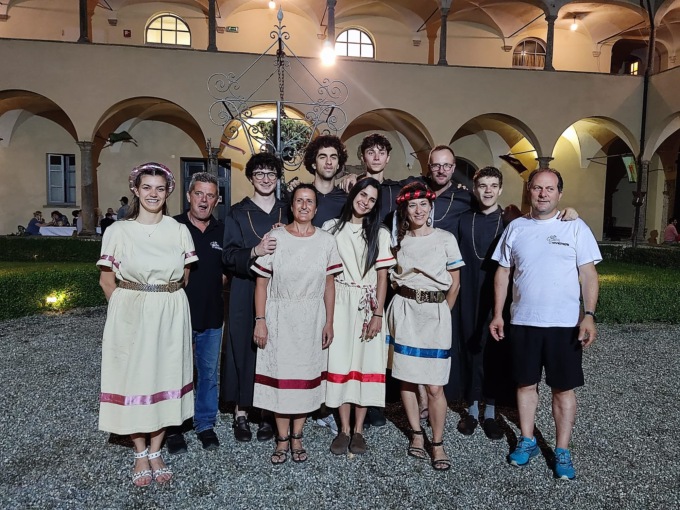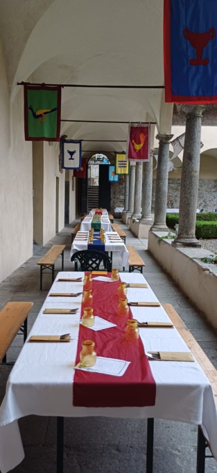 In seguito, coloro che si erano iscritti alla cena – momento clue della serata – si sono recati al Chiostro di San Calocero, dove è stata servita – naturalmente da monaci e damigelle – la “cena medievale”, con un ricco menù, rispecchiante le tradizioni culinarie dell’epoca: per cominciare frutta fresca; a seguire insaccati di porco stagionati, frittatine con erbette del contadino, formaggio del crotto, orzotto benedettino, bocconcini di cinghiale, treccia di Ermengarda e, naturalmente, la tisana a fine pasto.