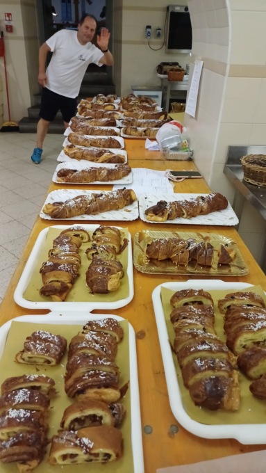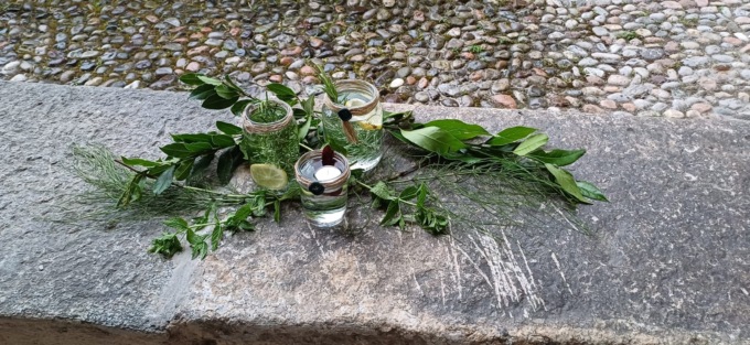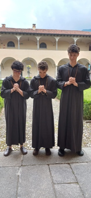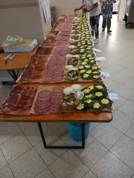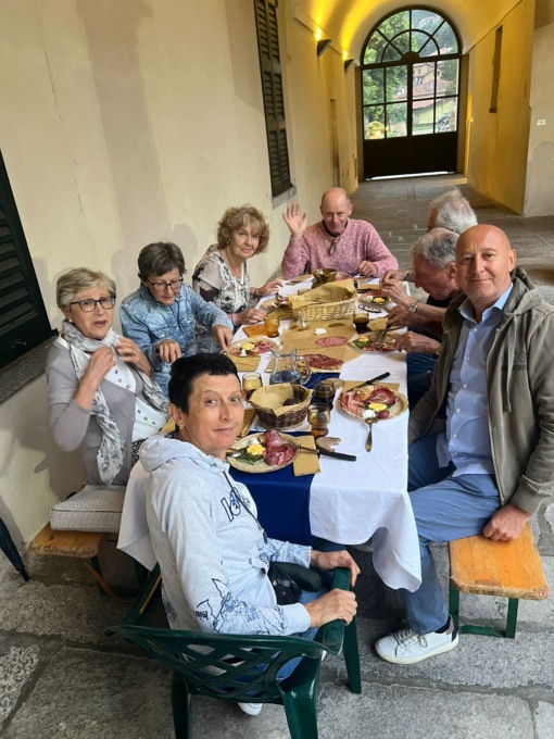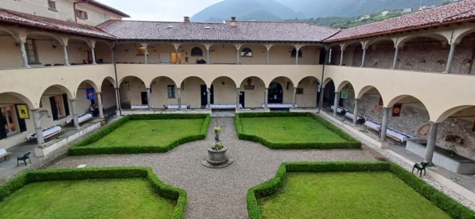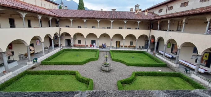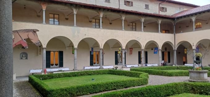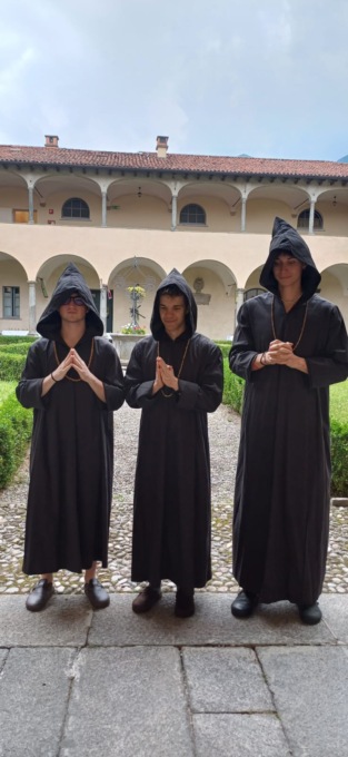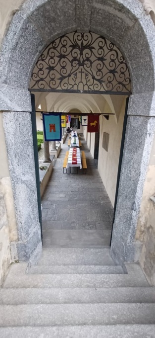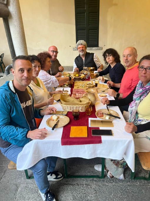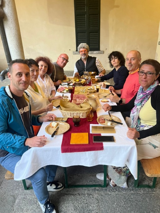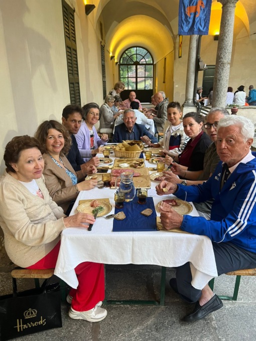 In seguito, coloro che si erano iscritti alla cena – momento clue della serata – si sono recati al Chiostro di San Calocero, dove è stata servita – naturalmente da monaci e damigelle – la “cena medievale”, con un ricco menù, rispecchiante le tradizioni culinarie dell’epoca: per cominciare frutta fresca; a seguire insaccati di porco stagionati, frittatine con erbette del contadino, formaggio del crotto, orzotto benedettino, bocconcini di cinghiale, treccia di Ermengarda e, naturalmente, la tisana a fine pasto.
