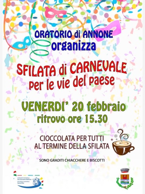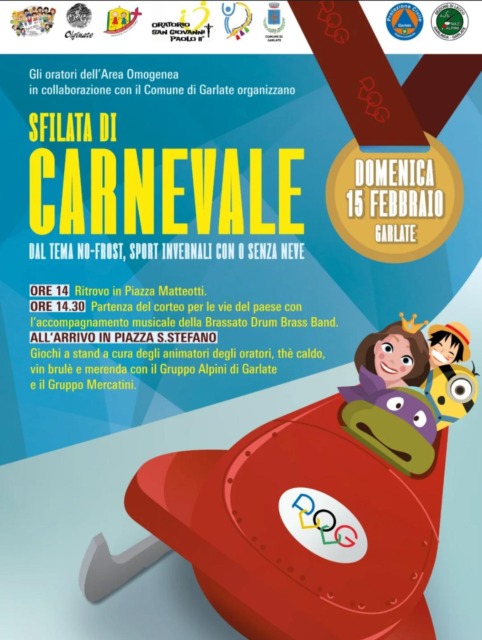L’Amministrazione Comunale di Mandello del Lario annuncia la sfilata di Carnevale sabato 14 febbraio alle 14.30 all’Oratorio del Sacro Cuore, punto di ritrovo e di partenza per la sfilata che poi proseguirà per via Nazario Sauro, via Cesare Battisti, piazza IV Novembre, via Dante e piazza Leonardo da Vinci. L’arrivo in piazza Leonardo da Vinci è previsto per le 15.00 dove si terrà lo spettacolo dei suonatori, trampolieri e giocolieri della Compagnia Spettacolo Senza Mura, a cura della Pro Loco di Mandello del Lario.