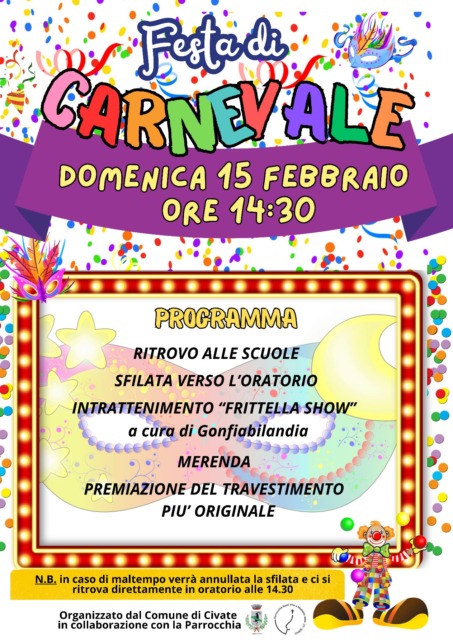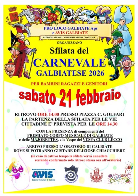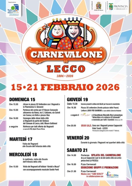 È alle porte il periodo dell’anno prediletto dai bambini, ma apprezzato anche da adolescenti e adulti, dove l’unico pensiero è divertirsi. Domani, sabato 14 febbraio 2026 si parte con Mandello e domenica 15 febbraio si festeggia a Lecco, Casatenovo, Civate, Oggiono, Ballabio e Garlate. Ma gli appuntamenti sono solo all’inizio…