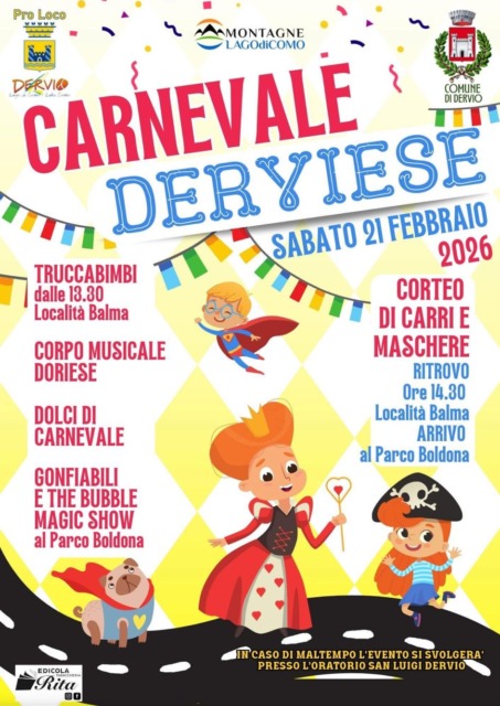 L’appuntamento a Dervio sabato 21 febbraio 2026 include anche il trucca bimbi!