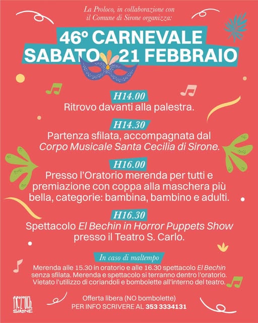 Infine nel comune di Sirone l’appuntamento è sabato 21 febbraio 2026.