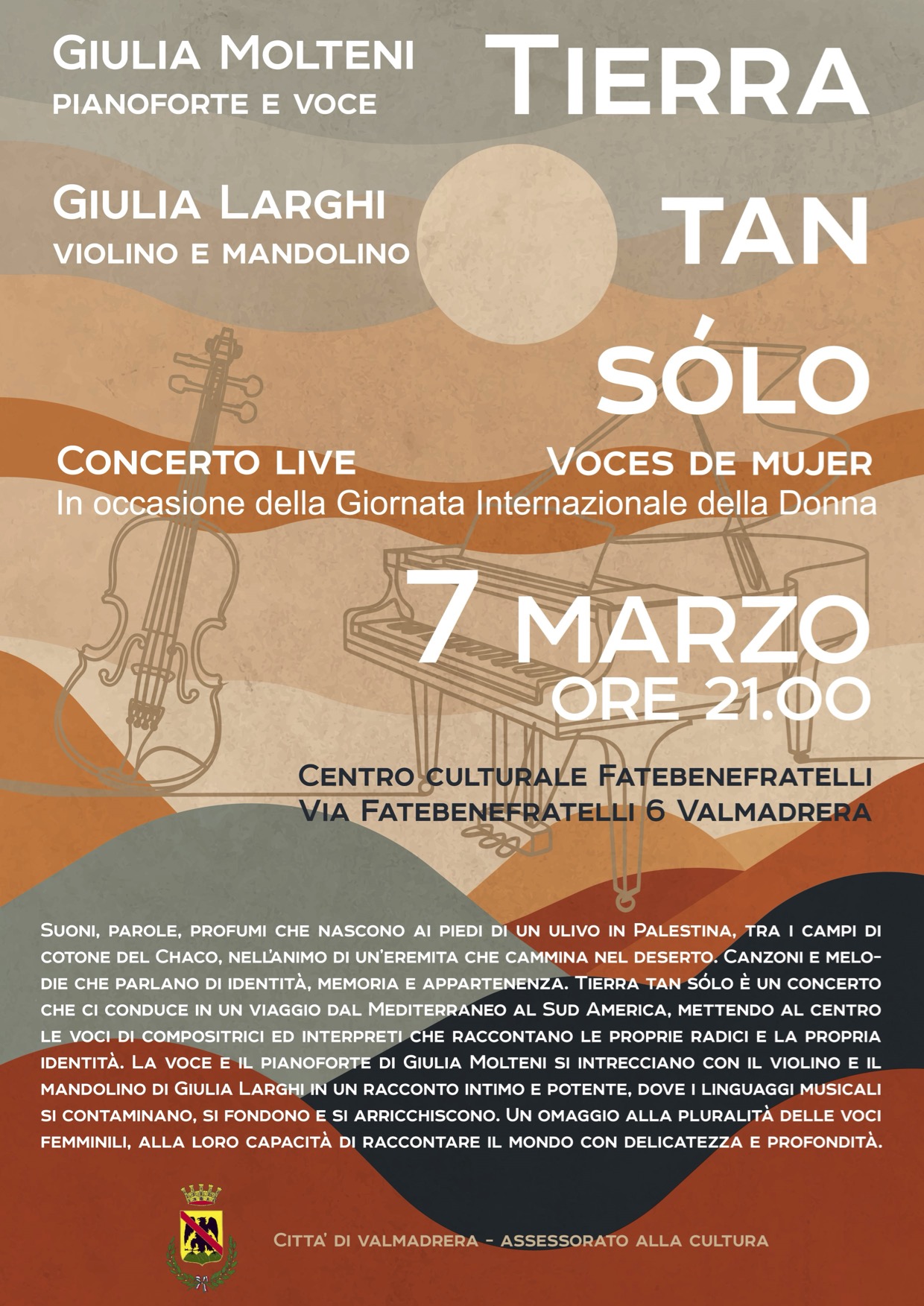 In occasione della Giornata Internazionale della Donna, l’Assessorato alla Cultura del Comune di Valmadrera propone per venerdì 7 marzo alle 21.00, presso il Centro Culturale Fatebenefratelli (via Fatebenefratelli 6), il concerto “Tierra Tan Sólo – Voces de mujer”.
