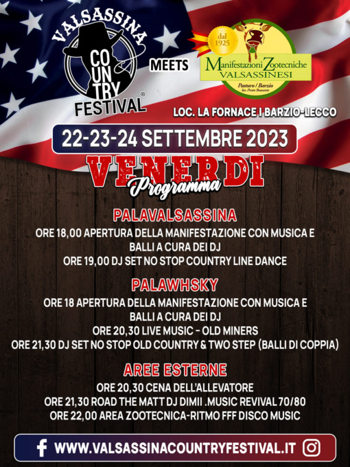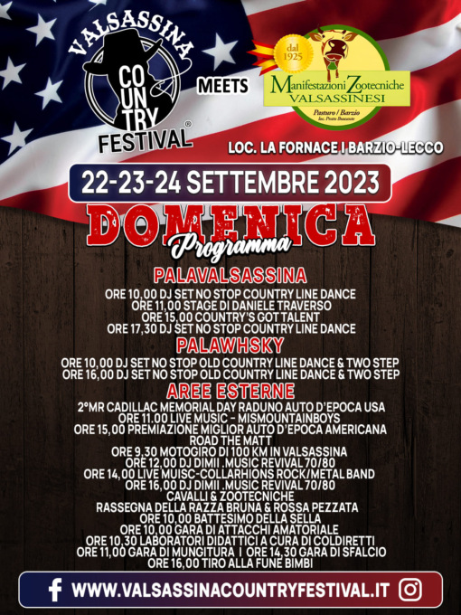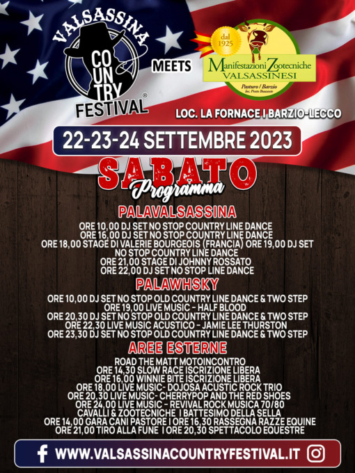 Anche in questo settembre 2023 torna l’accoppiata con il Valsassina Country Festival e il suo ventaglio di attrazioni sempre più ampio, con due strutture pronte ad accogliere importanti artisti musicali e i tanti appassionati di balli country, mentre per i più piccoli ci saranno il battesimo della sella e le giostre. Tra i momenti centrali della «doppia» festa l’esibizione del msuicista statunitense Jamie Lee Thurston sabato sera e la mostra della Vacca Bruna Alpina. Novità di questa nuova edizione, infine, il motoraduno «Road the matt» in collaborazione con gli Innominati di Vercurago.