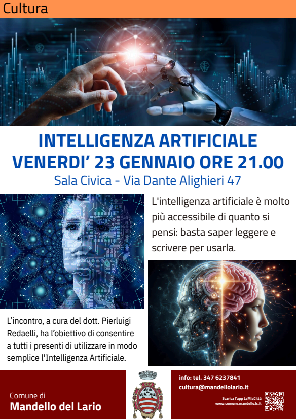 L’Amministrazione Comunale di Mandello organizza, per venerdì 23 gennaio 2026 alle 21 alla Sala Civica di Via Dante Alighieri 47, una serata per parlare di un tema che sta ridefinendo il nostro presente e delineando il nostro futuro: l’intelligenza artificuale. L’incontro sarà condotto dal dott. Pierluigi Redaelli, professionista – ormai pensionato – nel settore tecnologico e industriale.