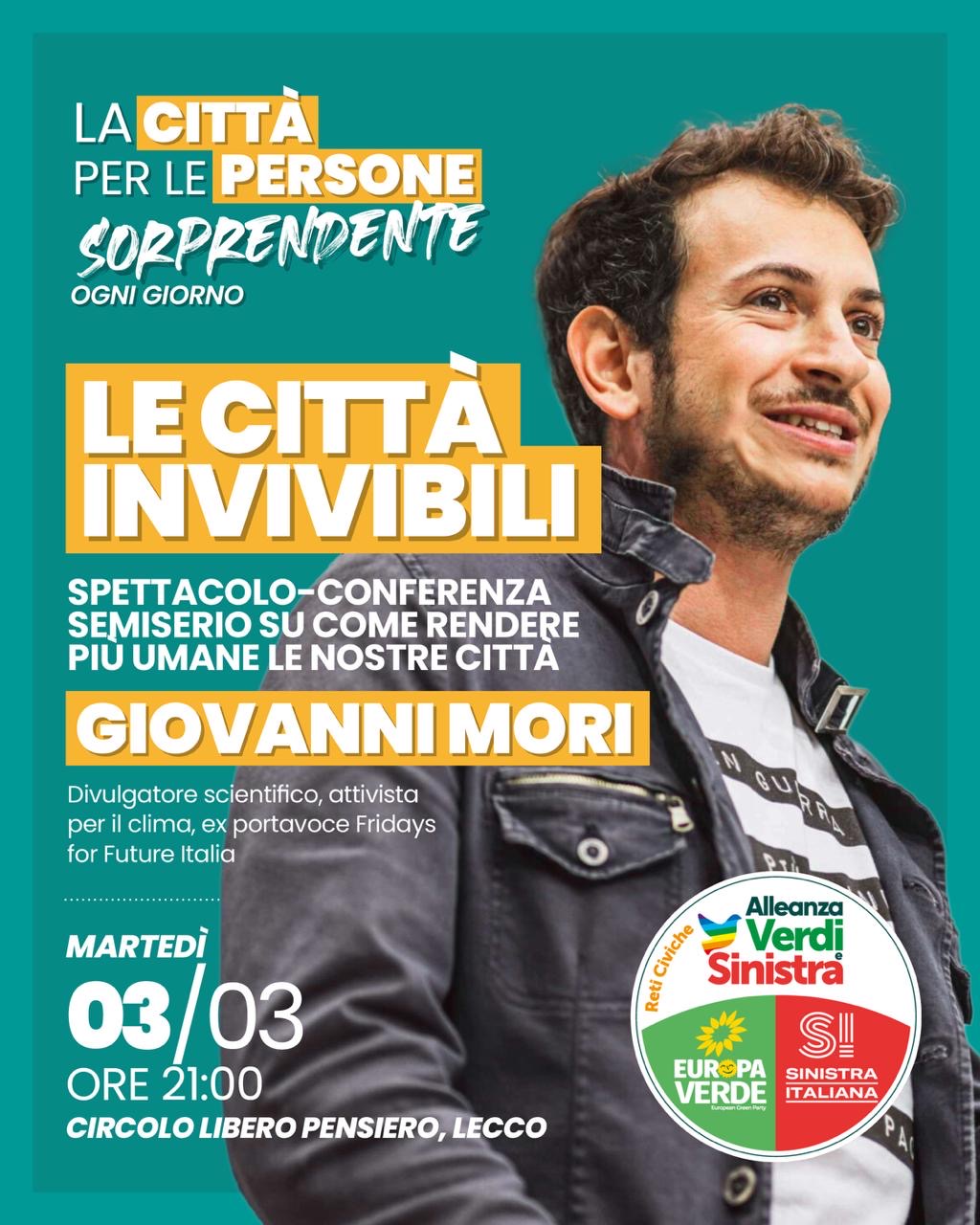 L’evento, dal titolo “Le città invivibili”, vedrà protagonista Giovanni Mori, divulgatore scientifico, attivista per il clima ed ex portavoce nazionale di Fridays for Future Italia.