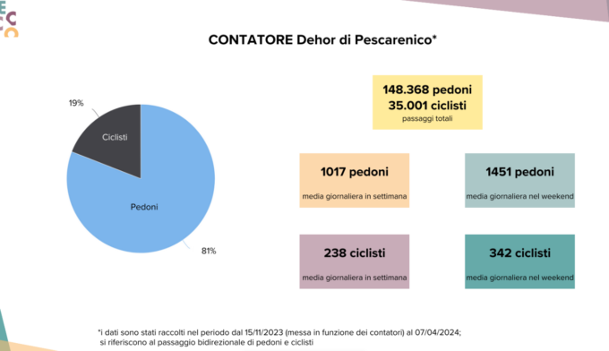 Numeri che ancora una volta, secondo l’Amministrazione, confermano l’attrattiva del territorio lecchese: dei tre contatori installati a Pescarenico, «Tamoil» in zona Caviate, e Bodega, quello più frequentato è il primo, con oltre 148mila accessi pedonali e 35mila ciclisti (dati raccolti dal 15 novembre al 7 aprile). Buono anche quello posizionato alla Tamoil, che segnala quasi 97mila accessi pedonali e 7.500 ciclisti. Pochi, invece, gli accessi al Bodega (6.629 pedoni), zona strategica in quanto punto di partenza del Sentiero del Viandante.