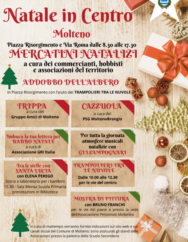 L’Amministrazione Comunale di Molteno organizza l’edizione 2025 di “Natale in Centro”, che si terrà domenica 7 dicembre 2025, dalle ore 8.30 alle 17.30, presso Piazza Risorgimento e Via Roma.