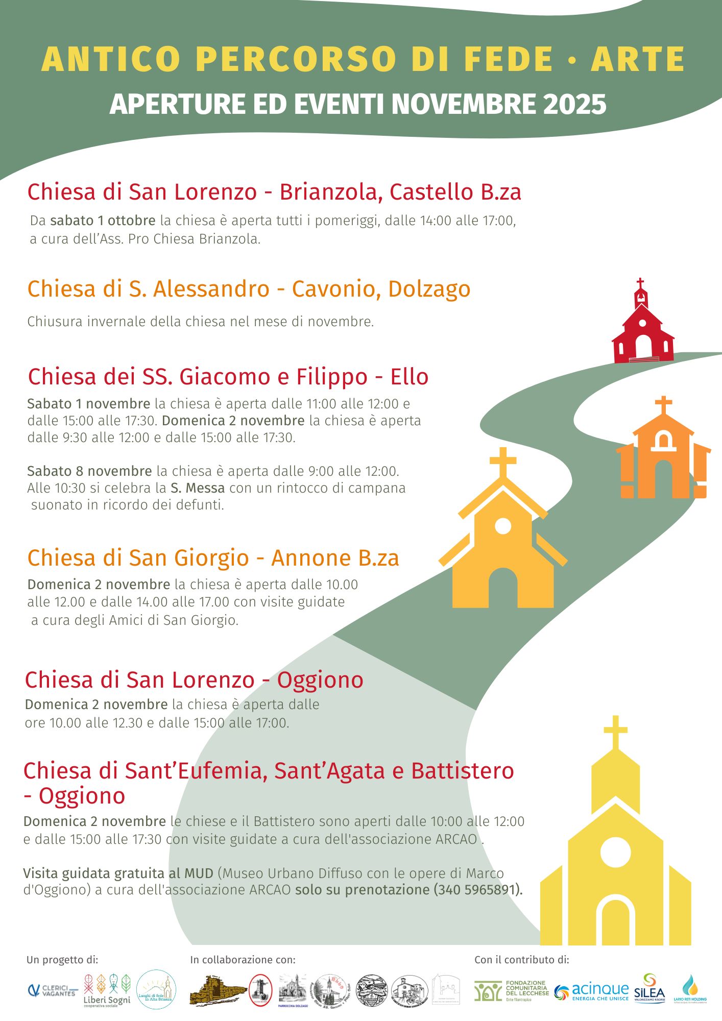 Un weekend di aperture ed eventi lungo il Percorso di fede dell’Alta Brianza. Anche il mese di novembre 2025 ci regalerà diverse iniziative di valorizzazione degli importanti siti religiosi dell’Oggionese che sorgono lungo l’Antico percorso di fede dell’Alta Brianza: le chiese di Annone, Oggiono, Ello e Castello saranno infatti visitabili grazie ai volontari della Pro Loco e gruppo Arcao di Oggiono, gli Amici della Chiesa di San Giorgio di Annone, l’ass Chiesa Santi Giacomo e Filippo di Ello, l’ass. Pro Chiesa di Brianzola di Castello.