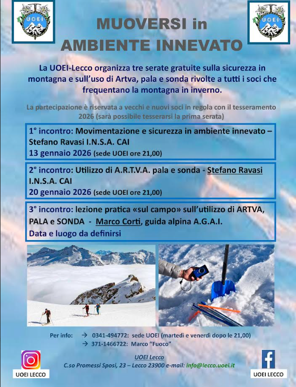 La UOEI Lecco inaugura il 2026 con una proposta dedicata al tema imprescindibile della sicurezza in montagna. Questo mese sono previste due serate teoriche e un’uscita pratica, pensate per approfondire la conoscenza della montagna in inverno e le corrette tecniche di sicurezza su terreno innevato.