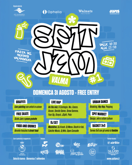 A sostenere e rendere possibile il progetto ci sono inoltre gli sponsor: Fest in Val, Sala al Bar, R-Evolution, BeAble Academy, Vibes SSD, Dulac, Area Saideno e Stile Danza ASD. Spit Jam è un evento gratuito e aperto a tutti.