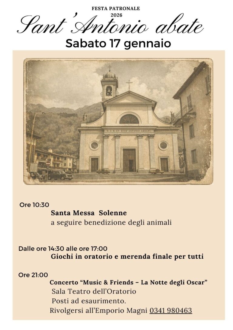 Nel pomeriggio, dalle 14:30 alle 17:00, l’oratorio accoglierà bambini, ragazzi e famiglie per giochi e momenti di socialità, conclusi con una merenda condivisa. La festa si concluderà in serata, alle 21:00, con il concerto “Music & Friends – La Notte degli Oscar” nella Sala Teatro dell’Oratorio, offrendo alla comunità un’occasione di cultura e musica. I posti sono limitati; informazioni e prenotazioni presso l’Emporio Magni (tel. 0341 980463).