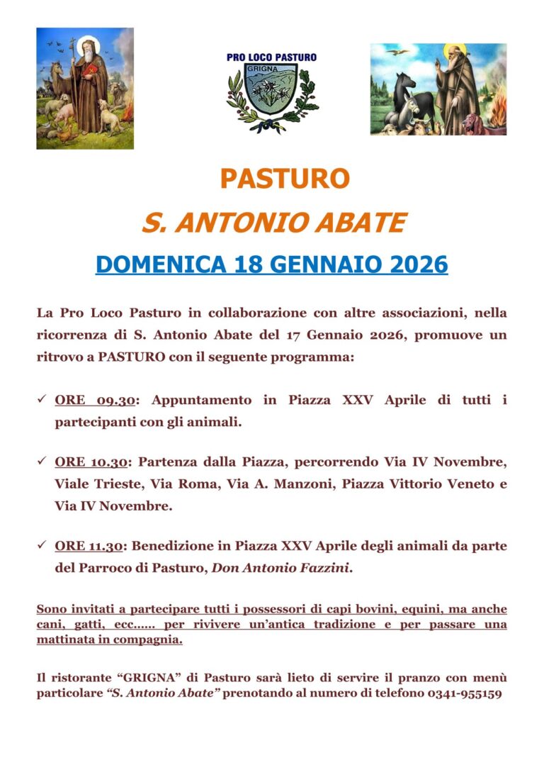 Un’occasione aperta a tutti, pensata per riscoprire le radici contadine del territorio e rafforzare il senso di appartenenza alla comunità. Per chi vorrà prolungare la giornata, il ristorante Grigna di Pasturo propone un menù dedicato a Sant’Antonio Abate; consigliata la prenotazione al numero 0341 955159.